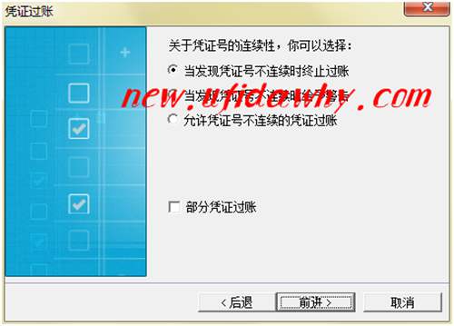 第二步:記賬王系統(tǒng)可提供靈活便利操作,就憑證號連續(xù)性問題提供三個選項,供客戶根據(jù)企業(yè)對憑證號連續(xù)性要求的高低進行選擇,然后選擇后點擊【前進】和【完成】按鈕即可完成憑證過賬操作。
