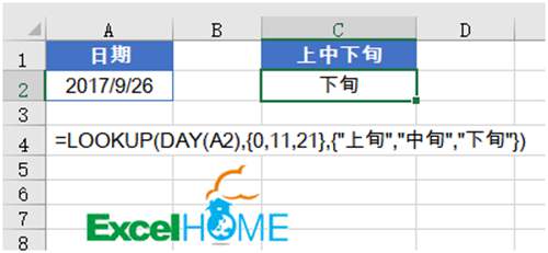 先用DAY函數(shù),判斷A2單元格的日期是幾號,然后用LOOKUP函數(shù)近似匹配,如果在0~10之間就是上旬,在11~20之間就是中旬,其他就是下旬。