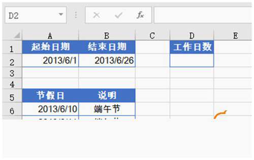 如下圖,使用函數(shù)可以計算兩個日期之間,去除周末和法定節(jié)假日的工作日天數(shù)。