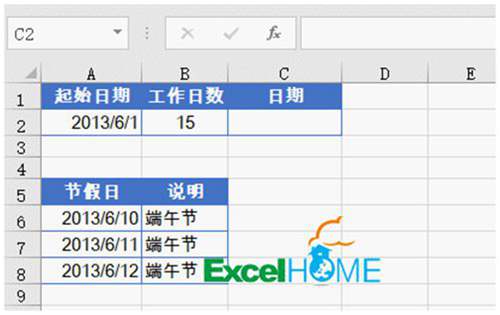 如下圖,使用函數(shù)可以計算n個工作日之后是哪天。公式為: