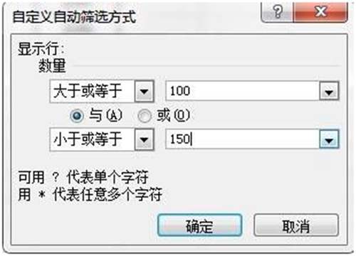 如果我們只想把“銷售情況統(tǒng)計表”中,所有商品數(shù)量區(qū)間為“100-150”的銷售數(shù)據(jù)篩選出來,那么我們只需要找到對應(yīng)的標(biāo)題字段“數(shù)量”,點擊三角選項按鈕,在彈出的對話框中,選擇【數(shù)字篩選】,選擇【介于】,在【大于或等于】中輸入“100”,【小于或等于】中輸入“150”。這時,所有商品數(shù)量區(qū)間為“100-150”的銷售數(shù)據(jù)就被篩選出來了。