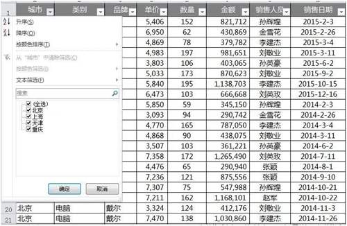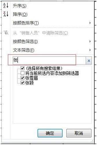 如果我們只想把“銷售情況統(tǒng)計表”中所有姓“張”的業(yè)務(wù)員業(yè)績篩選出來,那么我們只需要找到對應(yīng)的標(biāo)題字段“姓名”,點擊三角選項按鈕,在彈出的對話框中,輸入“張”。這時,所有姓“張”的業(yè)務(wù)員業(yè)績情況明細就被篩選出來了。