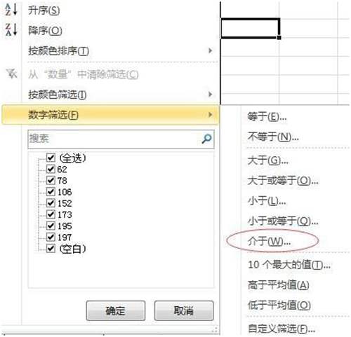 注意,這里的商品數(shù)量屬于數(shù)字類型字段,如果我們選擇的是商品名稱等文字型的字段,則在做篩選時,出現(xiàn)的是【文字篩選】對話框,原理是一樣的,按照我們上述的方法進行相應(yīng)操作即可。