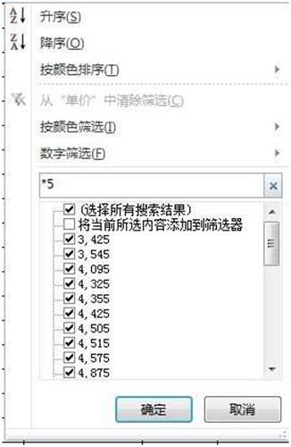 如果我們只想把“銷售情況統(tǒng)計表”中,所有商品單價“以5結(jié)尾”的銷售數(shù)據(jù)篩選出來,那么我們只需要找到對應(yīng)的標(biāo)題字段“單價”,點擊三角選項按鈕,在彈出的對話框中,輸入“*5”。這時,所有商品單價“以5結(jié)尾”的銷售數(shù)據(jù)就被篩選出來了。