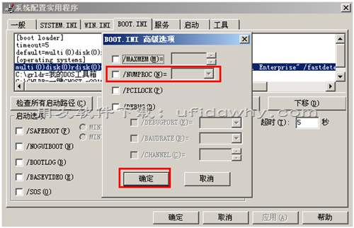 第三步:把boot.ini高級(jí)選項(xiàng)里面的numproc打上“√”,把值修改成1然后點(diǎn)擊確定,然后重新啟動(dòng)電腦;