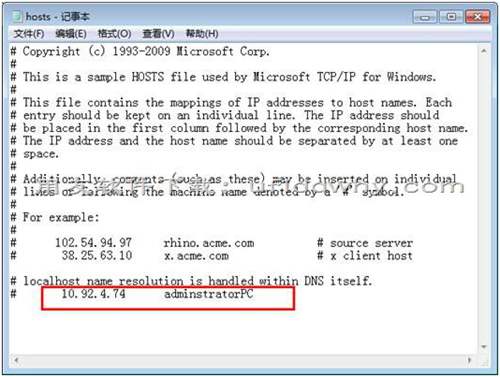 2)以記事本的方式打開,在HOSTS文件中加入服務(wù)器的IP和名稱(不知道怎么看IP的請(qǐng)參考一下:http://m.emjs.com.cn/jcufida/573.html),如圖: