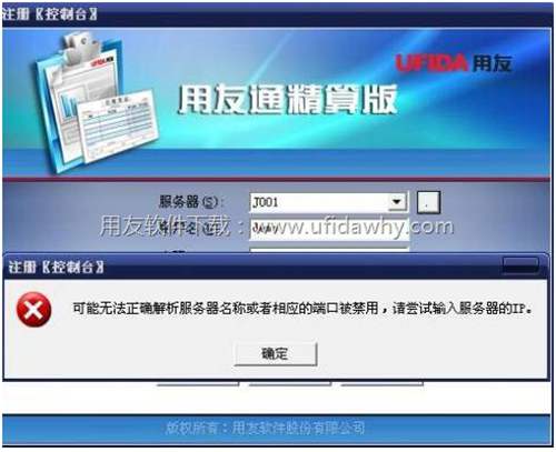 登錄用友T3財務(wù)軟件時,提示“可能無法正確解析服務(wù)器名稱或者相應(yīng)的端口被禁用,請嘗試輸入服務(wù)器的IP”,如下圖所示: