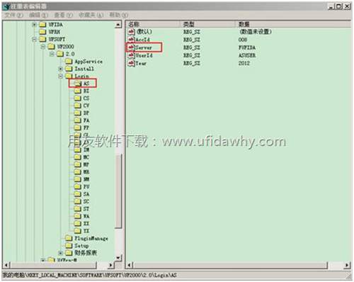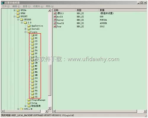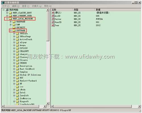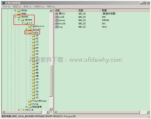 b、依次展開左側(cè)HKEY_LOCAL_MACHINE-SOFTWARE-UFSOFT-UF2000-UF2.0-LOGIN,如下圖所示: