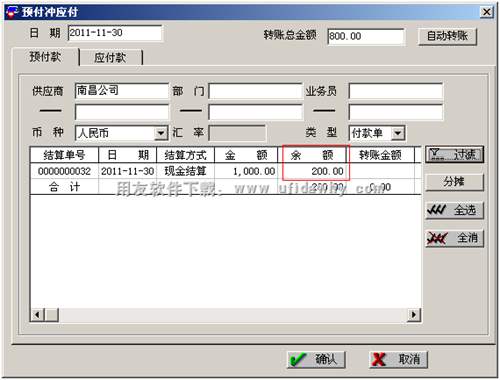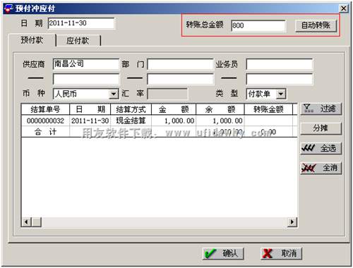 4、用之前預付的1000元中的800預付賬款沖應付賬款,點擊“采購管理”—“供應商往來”—“預付沖應付”,選擇對應的供應商,過濾出相應的預付款和應付款,錄入“轉(zhuǎn)賬總金額”后“自動轉(zhuǎn)賬”。