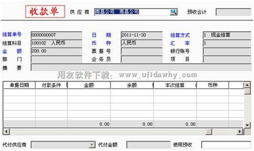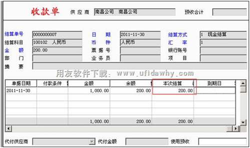 5、將剩余的200預付賬款收回,點擊“采購管理”—“供應商往來”—“付款結算”,選擇供應商后點擊“切換”,系統(tǒng)切換成收款單,增加一張200元的收款單