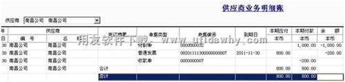 7、查看供應商往來明細賬,本期應付800元,付款800元平衡,剩余200元預付款已收回。
