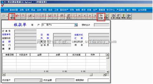 (6)退回的款項全部退回給客戶A在軟件中填制一張紅字的收款單(點擊“收款結算”-選擇客戶(1:客戶A)-“切換”-“增加”)