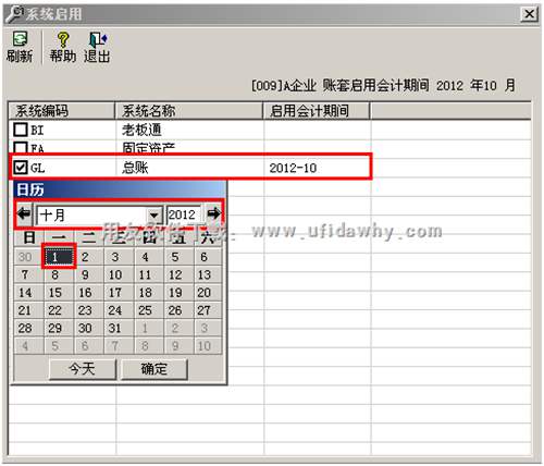 2、啟用“總賬”模塊,啟用時間為2012年10月1日,如下圖所示: