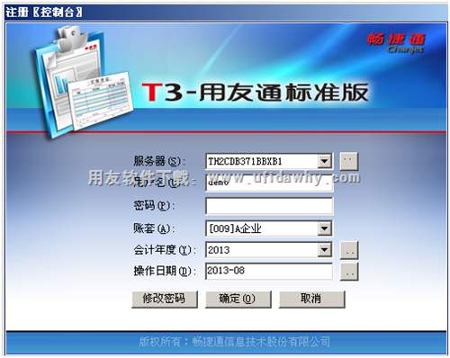 5、登錄用友T3財務(wù)軟件,會計年度選擇2013年,登錄時間為2013年8月,將2013年1月到7月直接結(jié)賬,如下圖所示: