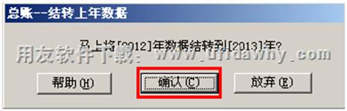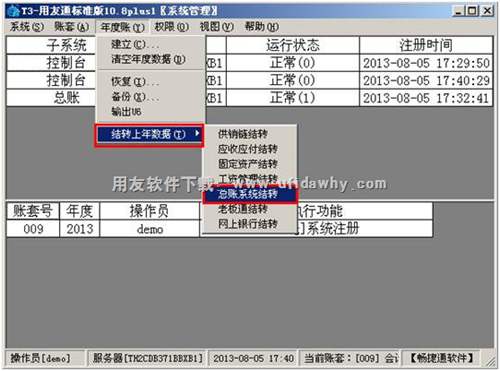 9、用賬套主管登錄用友通T3財務(wù)軟件系統(tǒng)管理,會計年度為2013年,點擊“年度帳”-“結(jié)轉(zhuǎn)上年”-“總賬系統(tǒng)結(jié)轉(zhuǎn)”,如下圖所示: