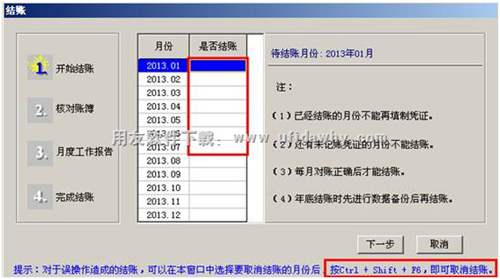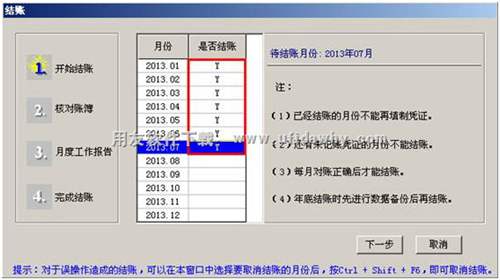 7、當8月份憑證錄完后,需要補錄之前的憑證,用賬套主管登錄T3軟件,點擊總賬系統(tǒng)“月末結(jié)賬”,選擇7月,鍵盤上按下“ctrl+shift+F6”,取消結(jié)賬,相同方法,把2013年1月到6月的結(jié)賬都取消,如下圖所示: