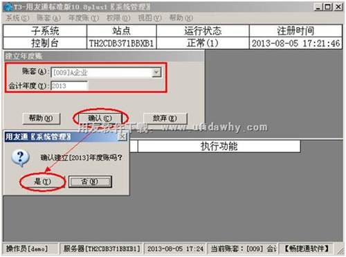 4、用賬套主管登錄用友T3財務(wù)軟件的系統(tǒng)管理,點擊“年度賬”-“建立”,根據(jù)提提示分別點擊“確定”和“是”,最后提示“建立年度:[2013]成功。”,如下圖所示: