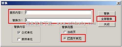 (4)替換合計(jì)單元的公式,選中B列,右鍵選擇“替換”,查找內(nèi)容“C”,替換為“B”,替換內(nèi)容“公式單元”,替換范圍“已選中單元”,點(diǎn)擊全部替換: