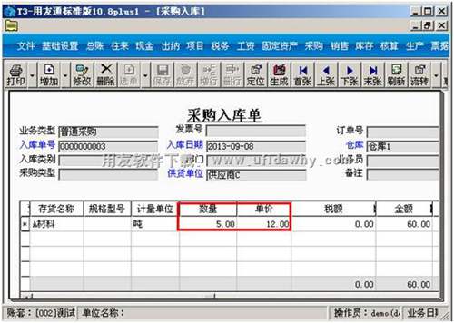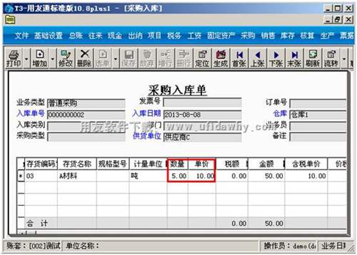 (2)增加一張入庫單,在采購模塊點擊“采購入庫單”—“增加”采購入庫單,輸入存貨?(數(shù)量5,單價10):