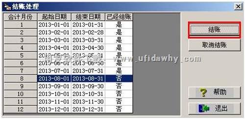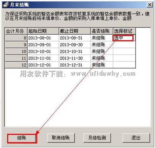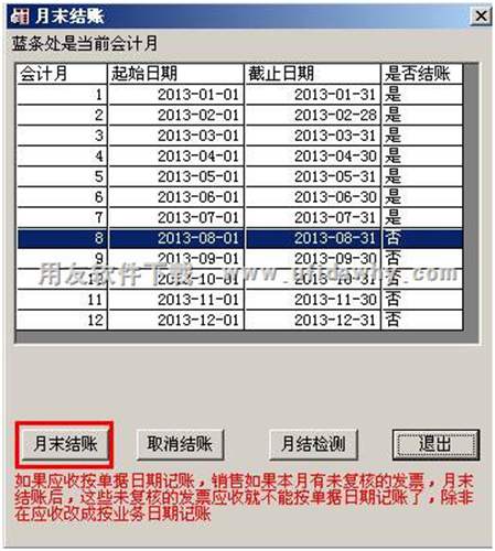 (5)8月進行結(jié)賬。在采購模塊、庫存模塊、銷售模塊和核算模塊點擊“月末結(jié)賬”。