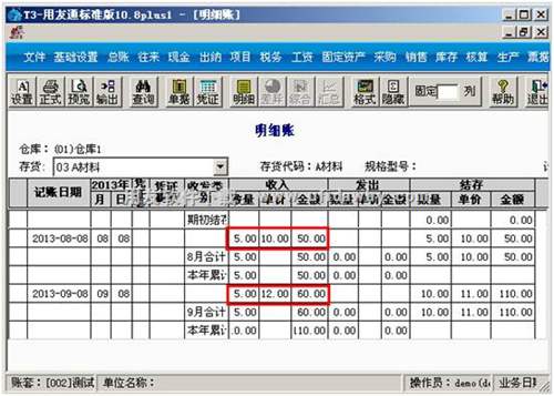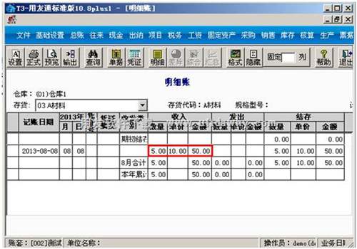 (9).采購入庫單直接正常單據(jù)記賬后,查看明細(xì)賬,點擊菜單欄上的“核算”-“賬表”-“明細(xì)賬”,上月A材料單價并沒有變化