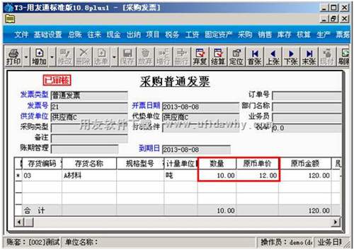 (1)首先打開用友T3財務(wù)軟件,先增加一張采購發(fā)票,在采購模塊點擊“采購發(fā)票”—“增加”輸入存貨(數(shù)量10,單價12元)保存: