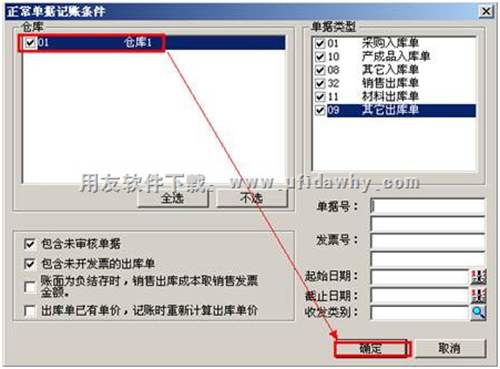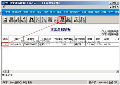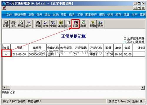 (8)在核算模塊點擊“正常單據(jù)記賬”選擇倉庫后點擊“確定,選中要記賬的單據(jù)再點擊“記賬”。