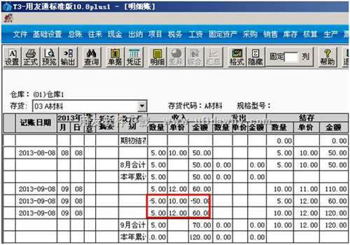 (11)暫估后再查看存貨A的明細(xì)賬,有一筆紅沖記錄,和一筆正確的金額,結(jié)存單價也變成12。