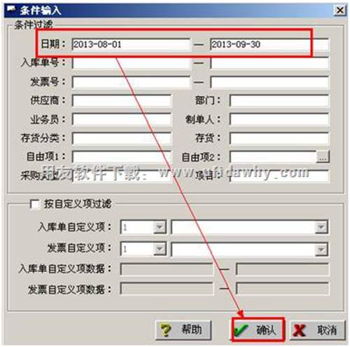 (7)進行結(jié)算:點擊“采購結(jié)算”選擇日期后“確定”將上月的采購發(fā)票和上月的采購入庫單以及本月的采購入庫單進行結(jié)算;
