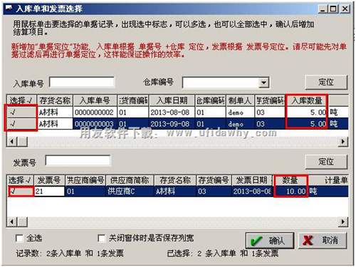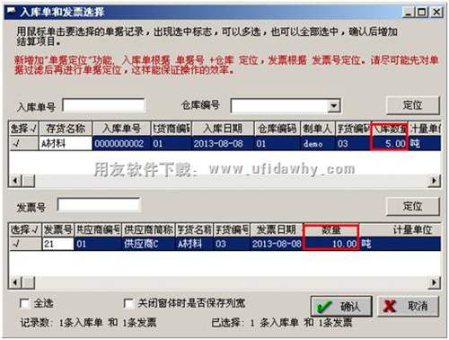 a.點擊“采購結(jié)算”-“確定”,選擇要結(jié)算的入庫單和發(fā)票再點擊“確定”。