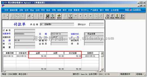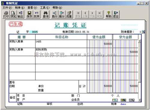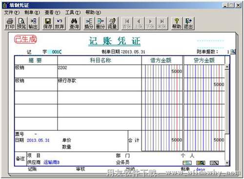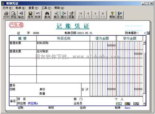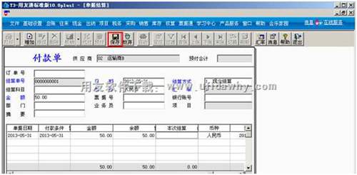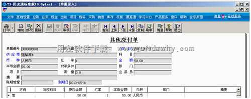 (7)對(duì)于50元運(yùn)費(fèi)如果需要確定應(yīng)付,可以到采購管理中填制應(yīng)付款(“采購”菜單 –“供應(yīng)商往來”- “應(yīng)付單” ),并形成應(yīng)付憑證(打開核算模塊,點(diǎn)擊“供應(yīng)商往來制單”-“應(yīng)付單制單”-“確認(rèn)”),而后續(xù)付款時(shí)可以到采購管理中填制付款單并核銷。