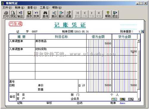 (5)將用友通T3軟件的入庫調(diào)整單保存后自動(dòng)記賬。在核算模塊的購銷單據(jù)制單對(duì)“入庫調(diào)整單”生成相應(yīng)的憑證(打開核算管理模塊,點(diǎn)擊“購銷單據(jù)制單”-“選擇”-選中“入庫調(diào)整單”-點(diǎn)擊“確認(rèn)”)