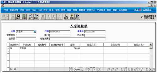 (4)此時(shí)收到采購運(yùn)費(fèi)發(fā)票50元,需要在核算管理中填制“入庫調(diào)整單”(點(diǎn)擊“核算”-“入庫調(diào)整單”),金額50元。