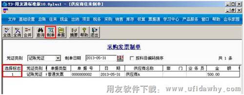 b)、供應(yīng)商往來制單中發(fā)票制單:對(duì)采購發(fā)票制單(打開核算管理模塊,點(diǎn)擊“供應(yīng)商往來制單”-“選擇”-選中“