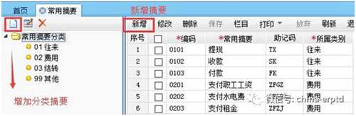 點(diǎn)擊“基礎(chǔ)設(shè)置”—“財(cái)務(wù)信息設(shè)置”—“常用摘要” 如下圖,常用摘要可以分類來(lái)設(shè)置,左側(cè)可以新增分類,右側(cè)的【新增】用于增加常用摘要 設(shè)置好常用摘要,在填制憑證時(shí)就可以選擇常用摘要。