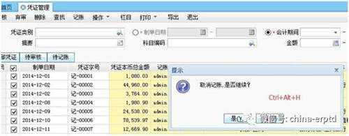 選擇要取消記賬的憑證,然后按下Ctrl+Alt+H,提示是否取消,點(diǎn)擊【是】即可注:在填制憑證界面也可以按下Ctrl+Alt+H來(lái)取消記賬
