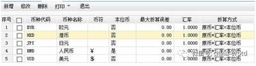 點(diǎn)擊“基礎(chǔ)設(shè)置”— “收付結(jié)算設(shè)置”— “幣種”,系統(tǒng)預(yù)置了一些常見的幣種,可以進(jìn)行新增、修改或刪除。