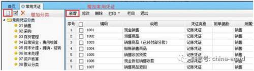 點(diǎn)擊“基礎(chǔ)設(shè)置”—“財(cái)務(wù)信息設(shè)置”—“常用憑證” 如下圖,常用憑證可以分類來(lái)設(shè)置,左側(cè)可以新增分類,右側(cè)的【新增】用于增加常用憑證 設(shè)置好常用憑證,在填制憑證時(shí)就可以選擇常用憑證,達(dá)到快速制單的目的。