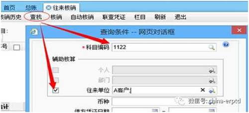 點(diǎn)擊“總賬”—“往來(lái)核銷” 點(diǎn)擊【查找】按鈕,選擇要核銷的往來(lái)科目,可以選擇相應(yīng)的輔助核算信息