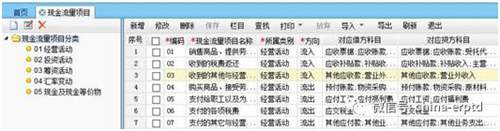 點(diǎn)擊“基礎(chǔ)設(shè)置”—“財(cái)務(wù)信息設(shè)置”—“現(xiàn)金流量項(xiàng)目” 如下圖,系統(tǒng)預(yù)置了現(xiàn)金流項(xiàng)目及對(duì)應(yīng)的借貸方科目,填制憑證時(shí)會(huì)自動(dòng)指定現(xiàn)金流
