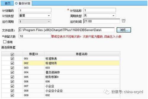 保留次數(shù):建議寫 10 天,因?yàn)檐浖膫浞菔歉采w式,0 表示不控制次數(shù),再勾選需要備份的賬套,保存即可