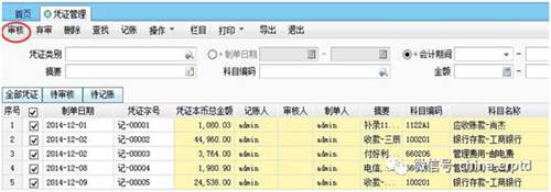 選擇要審核的憑證,然后點(diǎn)擊【審核】按鈕即可。 取消審核即【棄審】注:在填制憑證界面也可以進(jìn)行審核操作