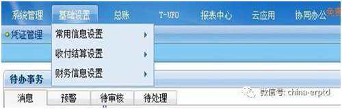 基礎(chǔ)設(shè)置位于主菜單的【基礎(chǔ)設(shè)置】下拉中,包括“常用信息”“收付結(jié)算”“財(cái)務(wù)信息”